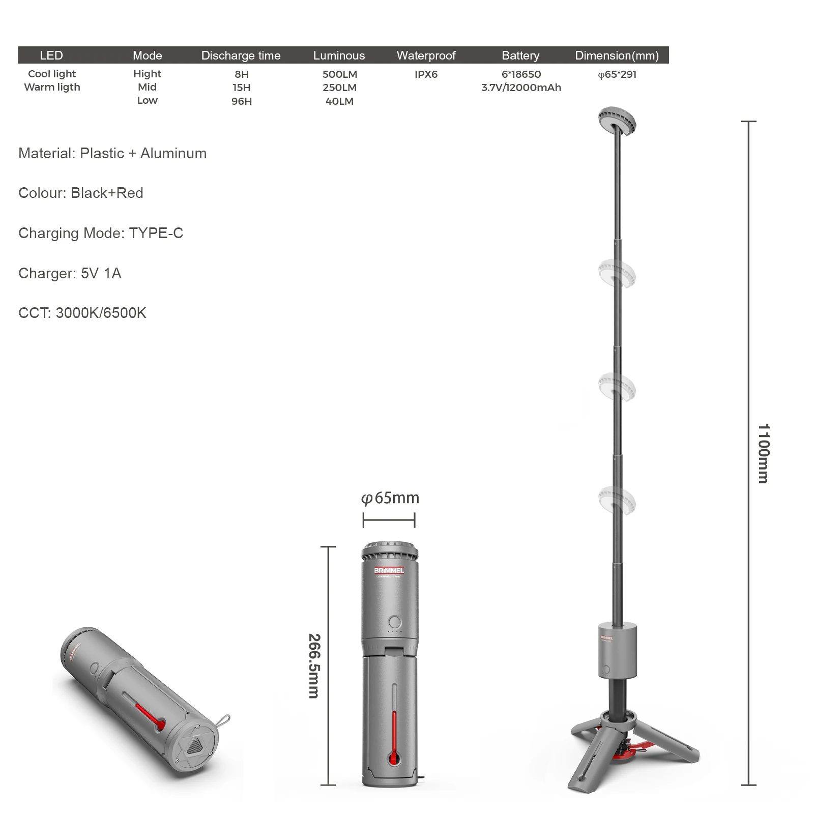 Vertak Outdoor Inspection Light Rechargeable Led Light Tripod Portable Working Cordless Camping Light for Construction Sites